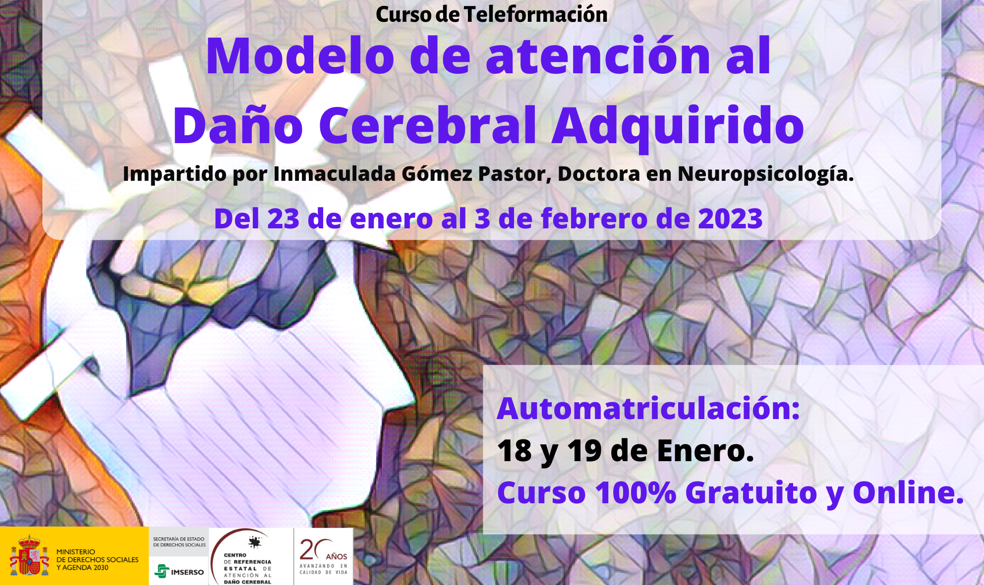 El Centro de Referencia Estatal de Atención al Daño Cerebral (Ceadac) dependiente del Imserso en Madrid, pone en marcha una nueva edición del curso online «Modelo de atención a personas con Daño Cerebral Adquirido», que impartirá Inmaculada Gómez Pastor, doctora en neuropsicología y directora gerente del Ceadac, del 23 de enero al 3 de febrero de 2023.