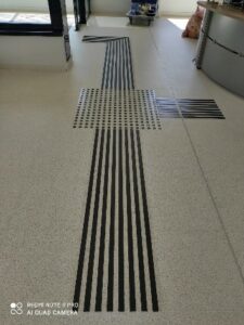 Encaminamiento interior y exterior: su función principal es dirigir a las personas con déficit visual y sin él, a los diferentes puntos de acceso. También se usa el podotáctil para indicar la existencia de los ascensores y las escaleras.