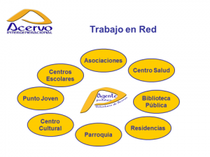 En la ejecución del proyecto se ha coordinado un trabajo de colaboración con los distintos entes municipales –Trabajo en Red- y se han establecido una serie de convenios y acuerdos de colaboración entre los que destacan los alcanzados con Cruz Roja y la ONCE. El primero se firmó en 2009 y establece que Cruz Roja proporciona el voluntariado de carácter asistencial mientras que Acervo Intergeneracional aporta su voluntariado cultural-intergeneracional para paliar la soledad de las personas desde la comunicación que proporciona la lectura de un buen libro. El segundo, aún por ratificar, se estableció en el año 2016 y permite facilitar la incorporación de las personas ciegas a su biblioteca municipal de referencia mediante la aportación de libros en braille y los últimos avances en lectura de los que dispone la ONCE.